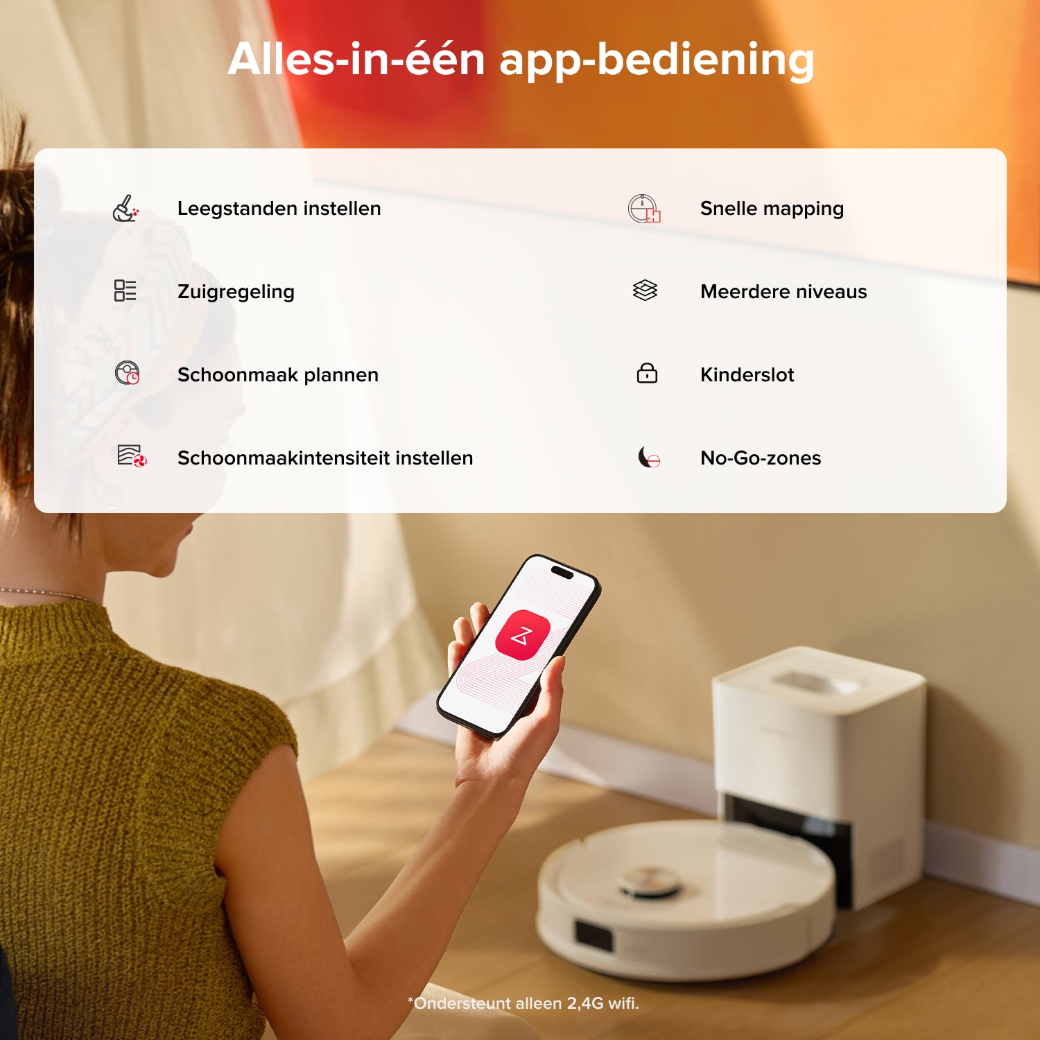 Automatische detectie (of ingesteld via de app) van tapijtzones, waardoor de zuigkracht wordt verhoogd voor een diepere reiniging en effectievere vuilverwijdering, wat zorgt voor een frisser, schoner huis.