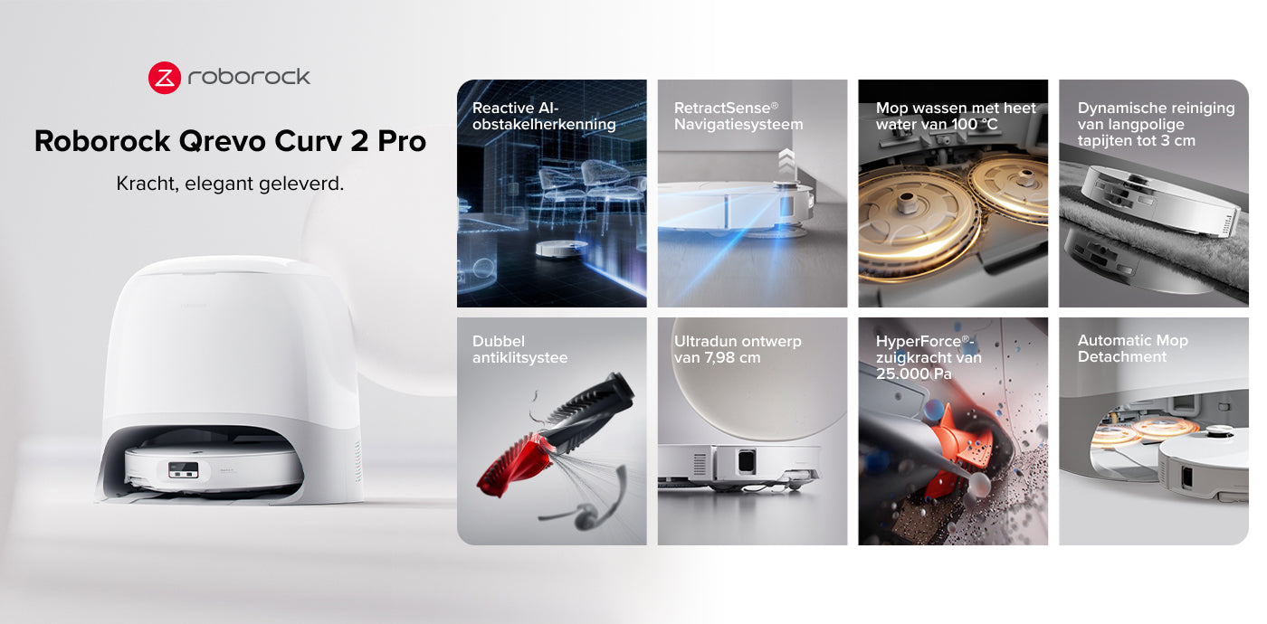 Roborock Qrevo Curv 2 Pro robotstofzuiger en dweil, zuigkracht van 25.000 Pa, antiklitsysteem, wassen met heet water van 100 °C, zelfreinigend, slimme obstakeldetectie, automatisch drogen, tapijtfunctie voor dierenhaardetectie - Wit