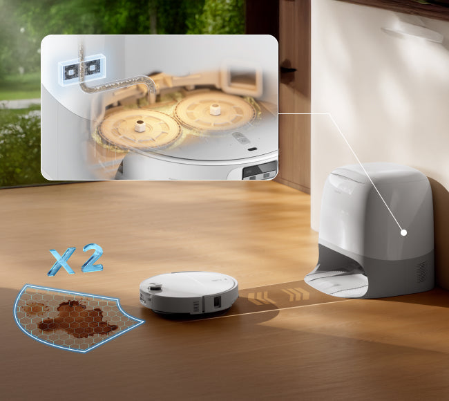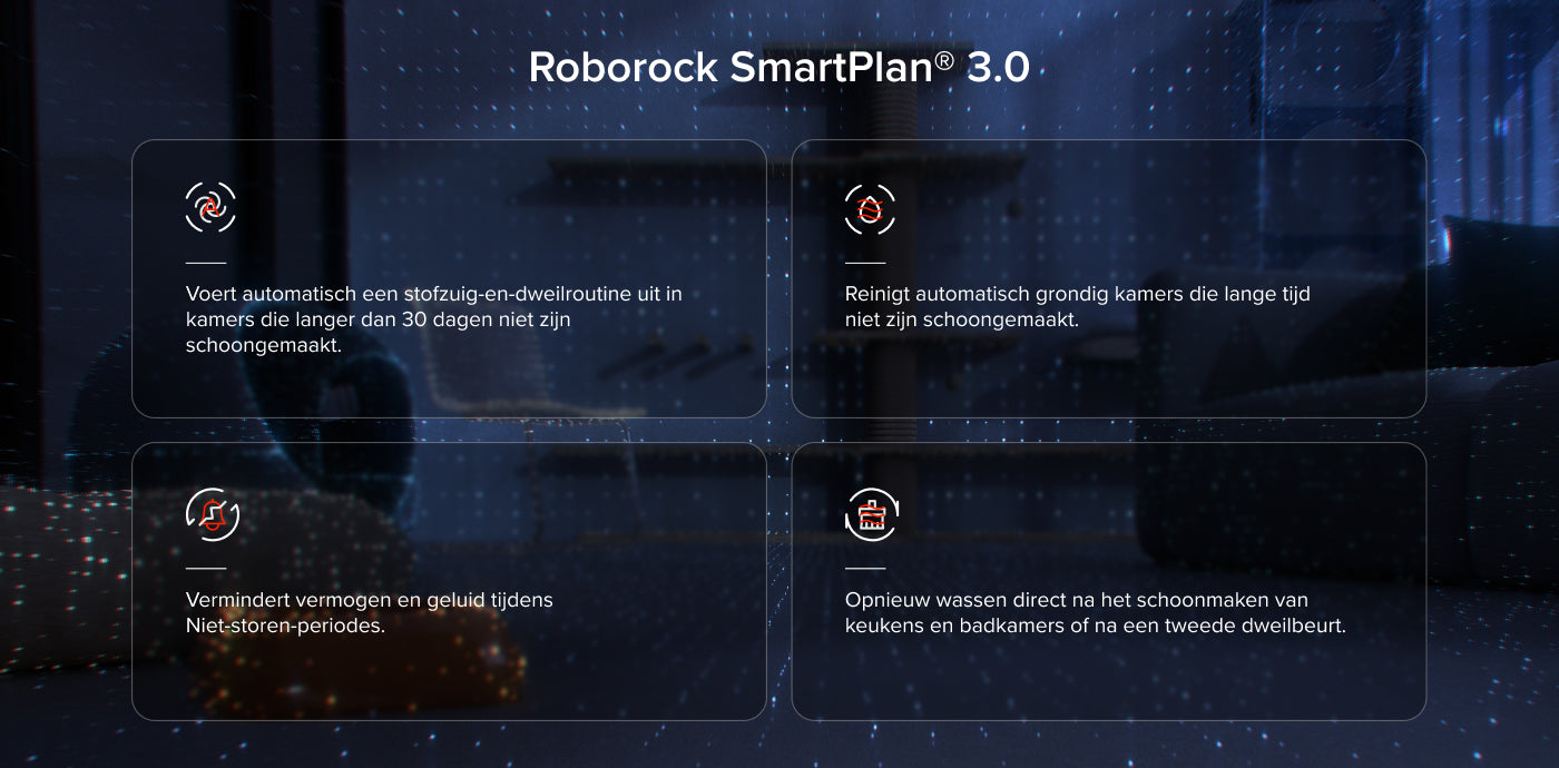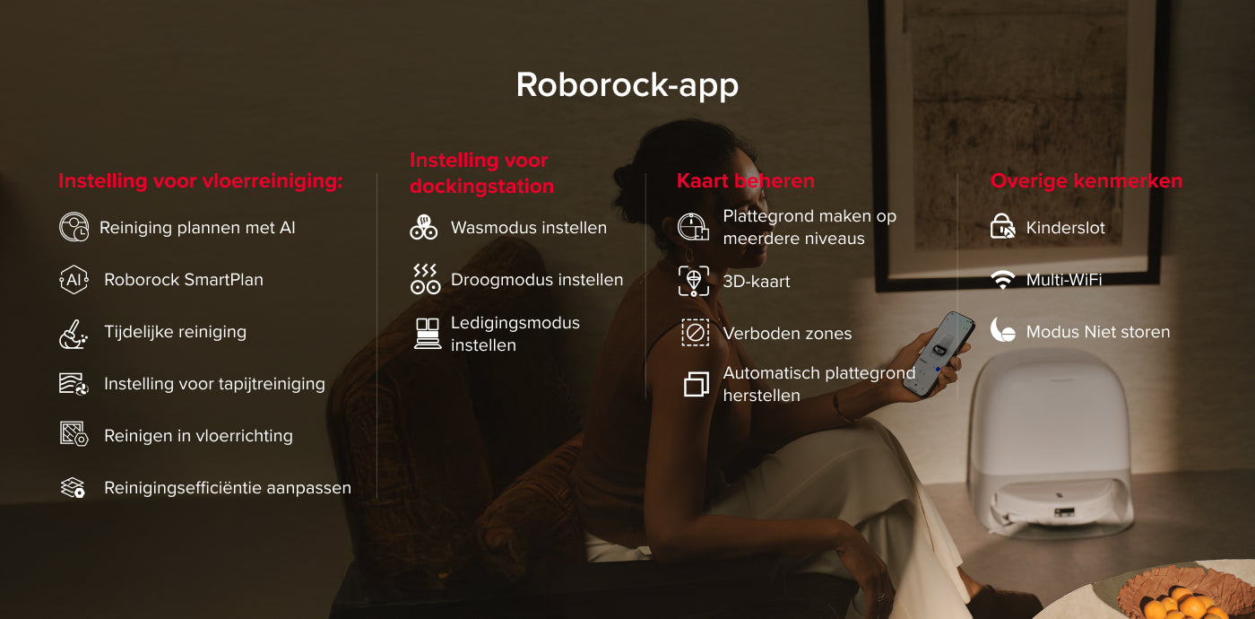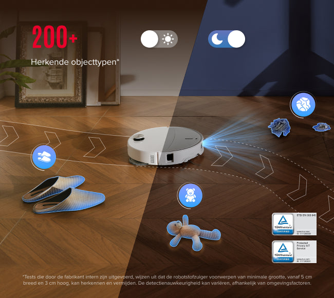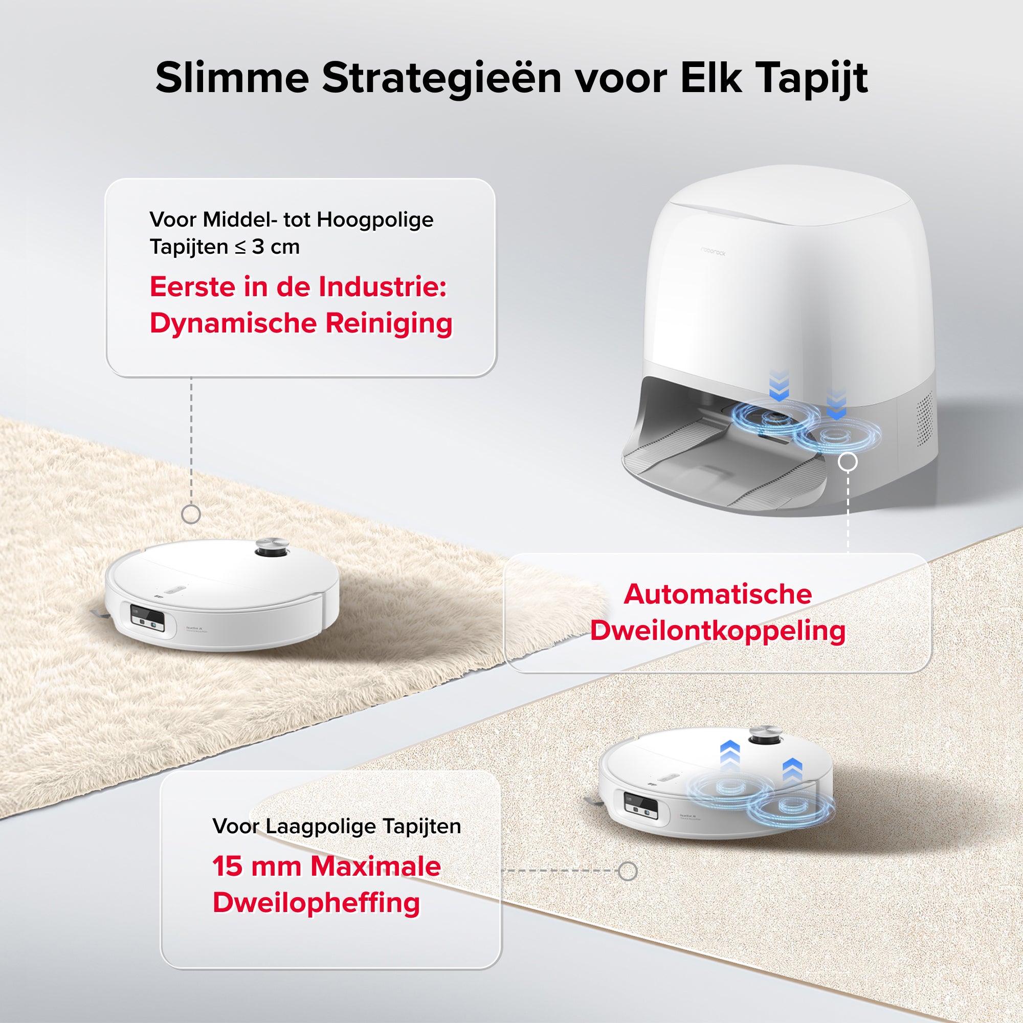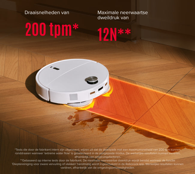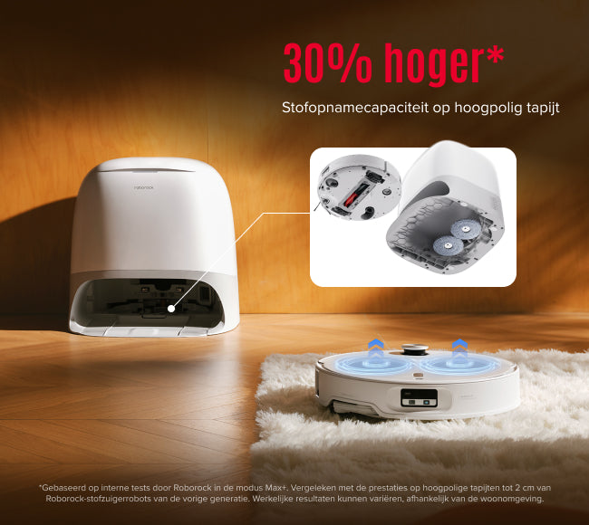 2.Deze functie moet handmatig worden ingeschakeld in de Roborock-app. Gebaseerd op interne tests door de fabrikant. De werkelijke resultaten kunnen variëren, afhankelijk van omgevingsfactoren.