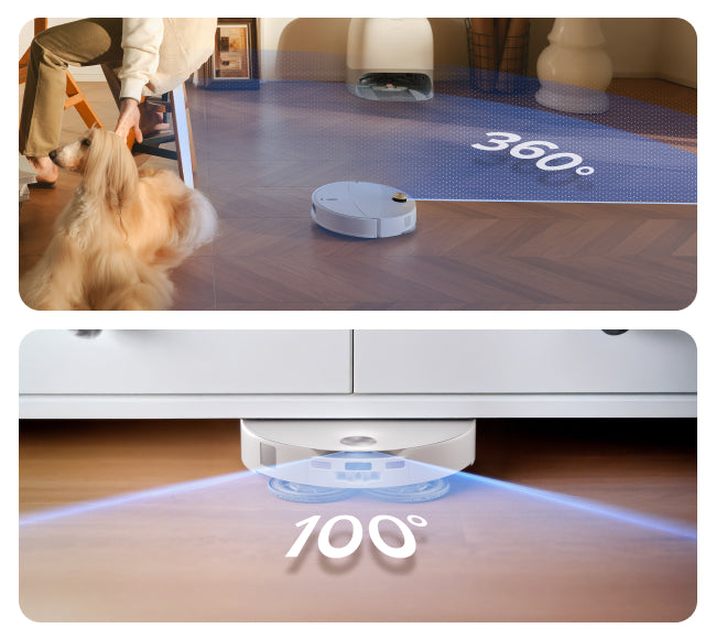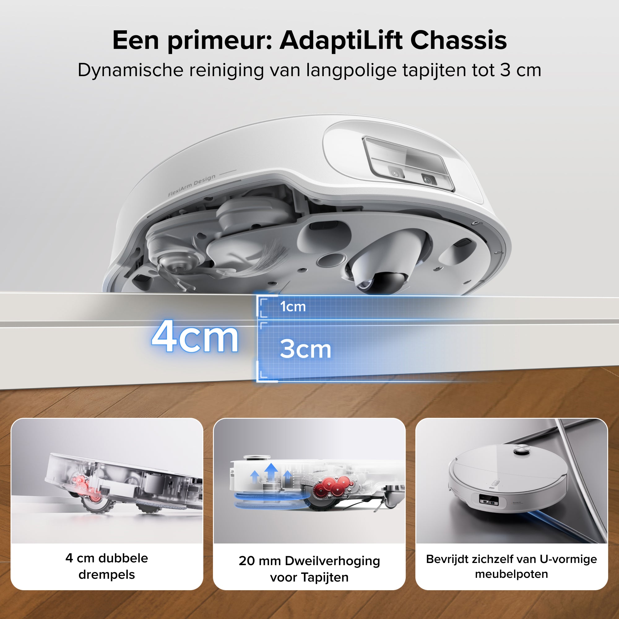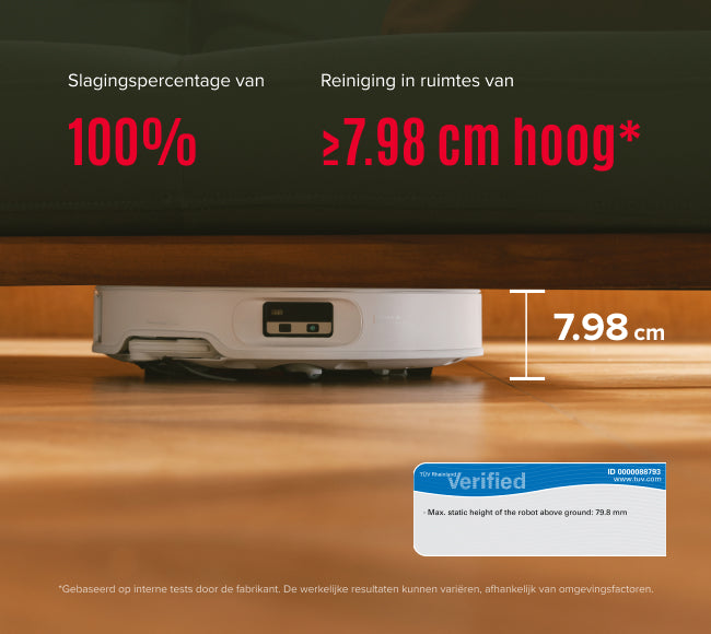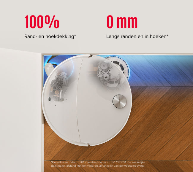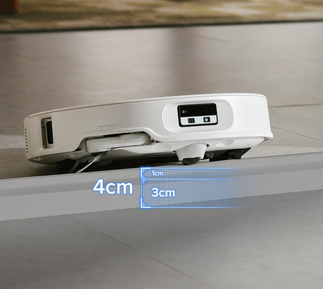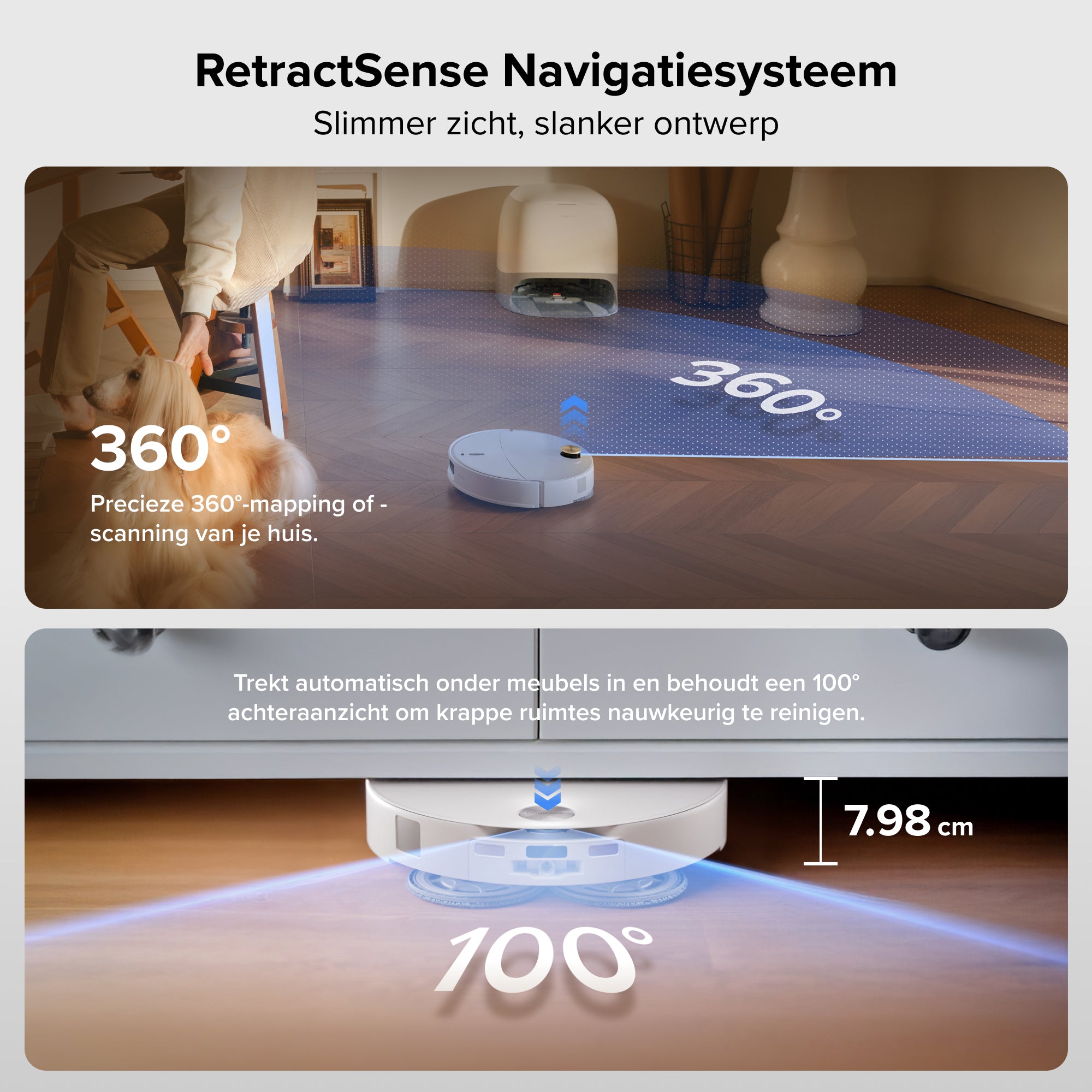 Dankzij een hoogte van slechts 7,98 cm en het volledig intrekbare LiDAR-systeem glijdt de stofzuiger moeiteloos onder lage meubels door, worden plekken bereikt waar andere stofzuigers niet bij kunnen en blijft geen stof achter.