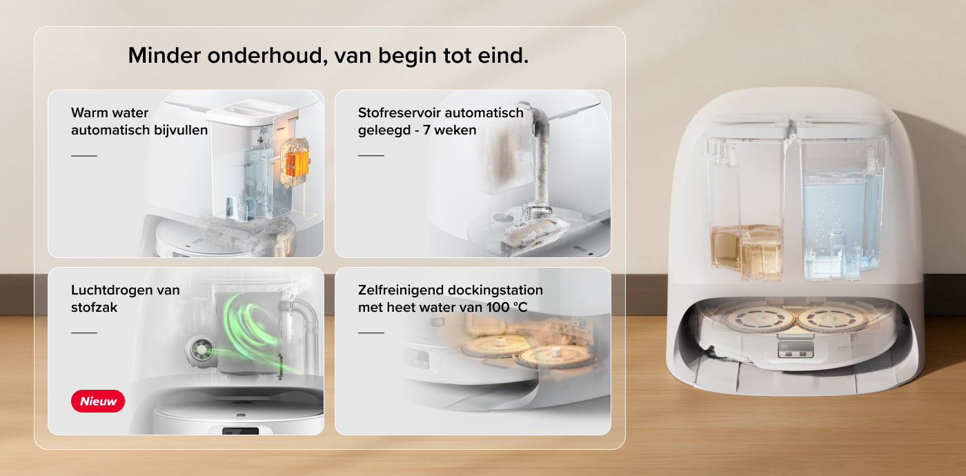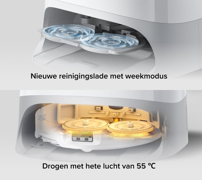 Drogen met hete lucht van 55 ℃ Droogt de moppen en de basis van het dockingstation grondig met warme lucht van 55 °C5 , waardoor schimmelvorming en onaangename geurtjes worden voorkomen.
