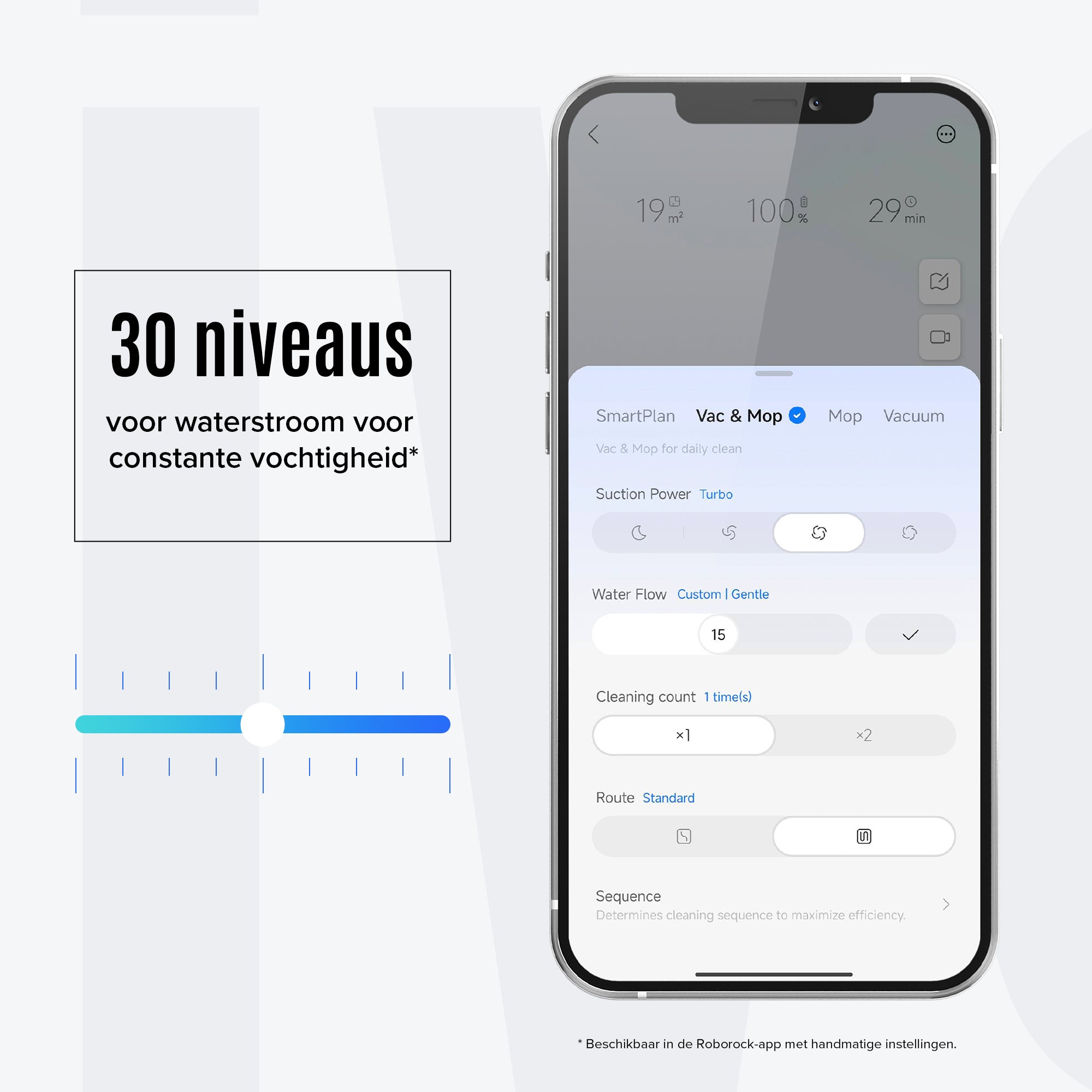 U kunt de waterstroom nauwkeurig afstellen op 30 verschillende niveaus, afhankelijk van het type vloer en de luchtvochtigheid.