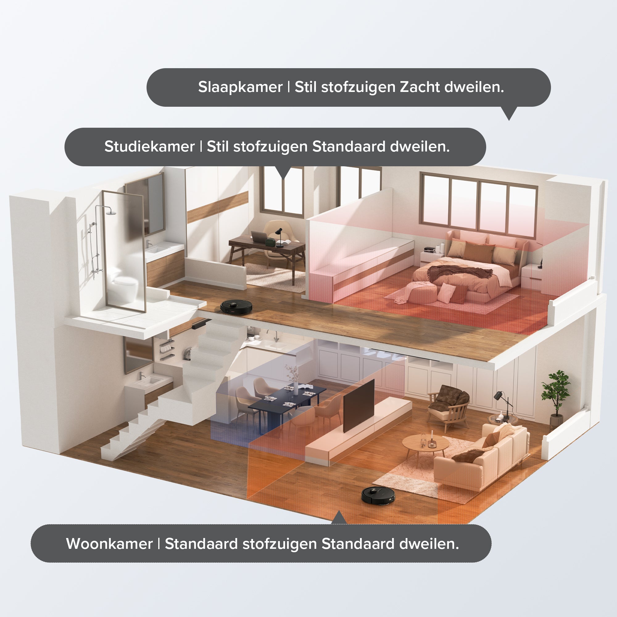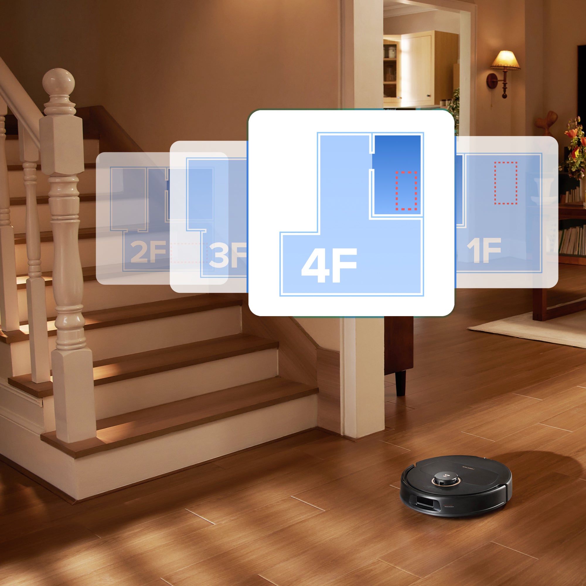 Het systeem om meerdere verdiepingen in kaart te brengen herkent en maakt automatisch kaarten voor maximaal 4 verdiepingen. U hoeft de robot alleen maar neer te zetten.
