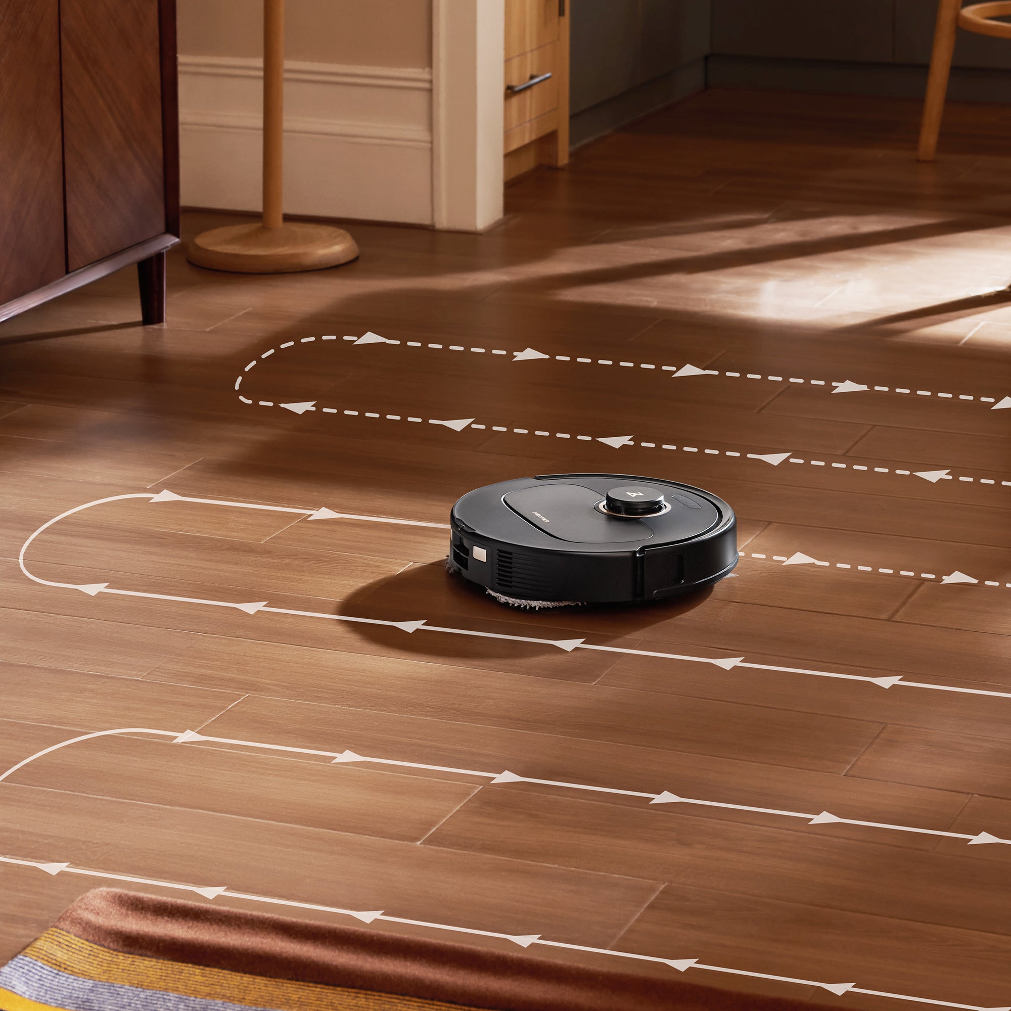 De robot reinigt in de richting van de vooraf ingestelde tegels om stof en haren beter uit kieren te verwijderen. Dit reduceert ook het wrijvingsgeluid van de hoofdborstel tegen naden en kieren in de vloer.