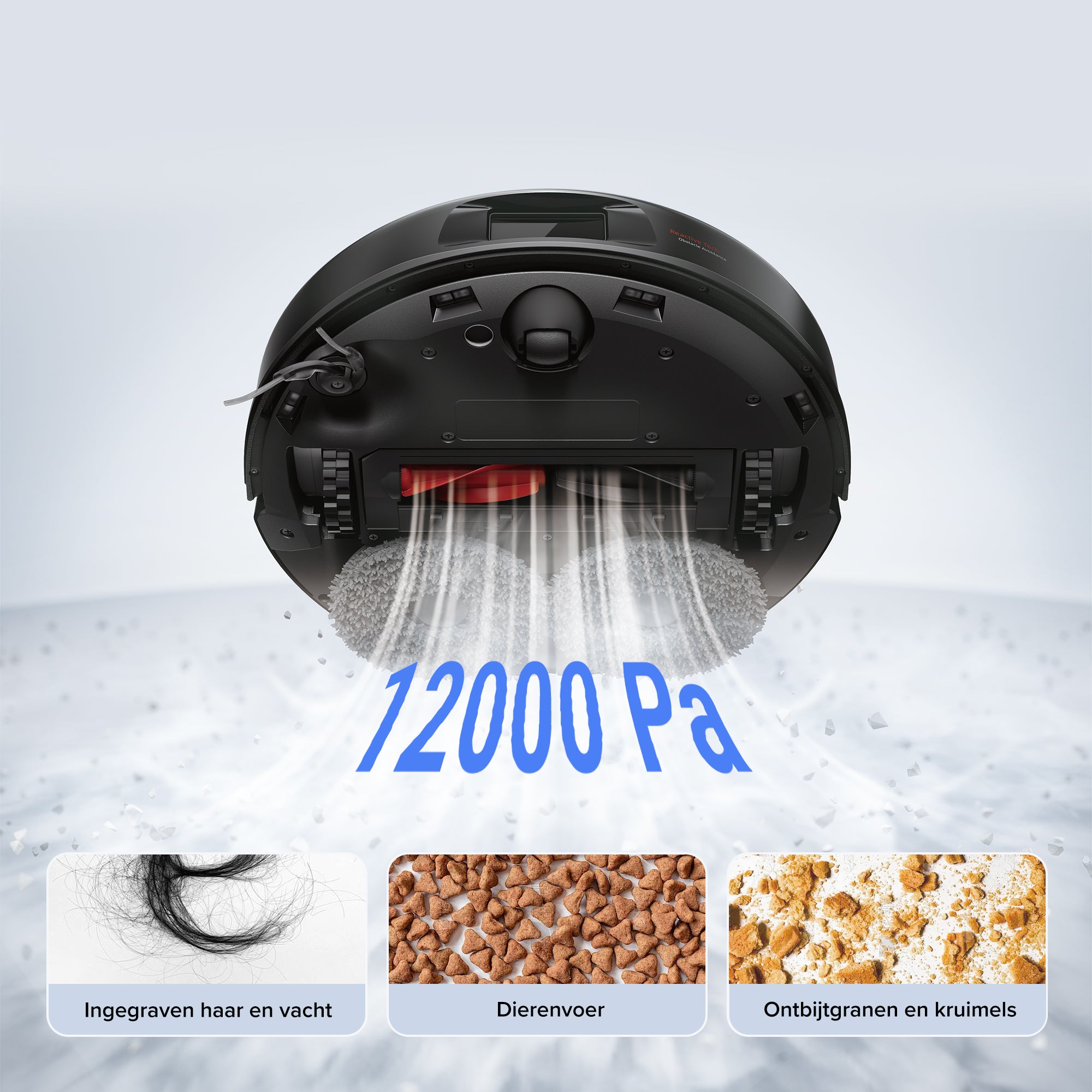 De indrukwekkende zuigkracht van 12.000 Pa* is ontworpen om haar en vuil te verwijderen uit vloerkieren en hoogpolige tapijten. Wanneer de robotstofzuiger op maximale zuigkracht werkt, neemt de snelheid van de hoofdborstel met 10% toe, wat zorgt voor een optimale stofverwijdering.