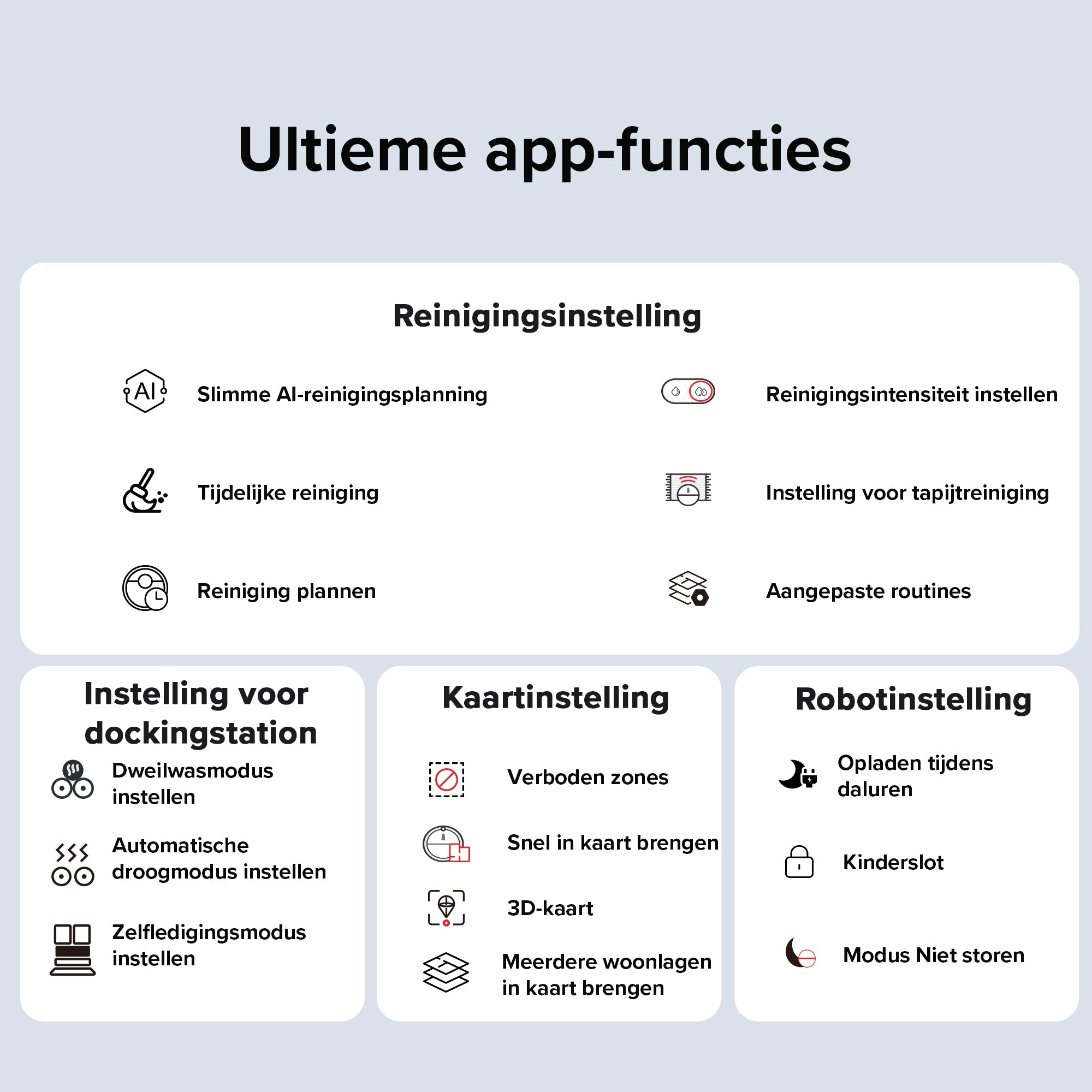 Niet alleen kunt u onzichtbare muren en verboden zones op maat instellen, maar de robotstofzuiger kan ook automatisch plekken detecteren waar deze snel vast kan komen te zitten en deze aanwijzen als verboden zones om dit te voorkomen.