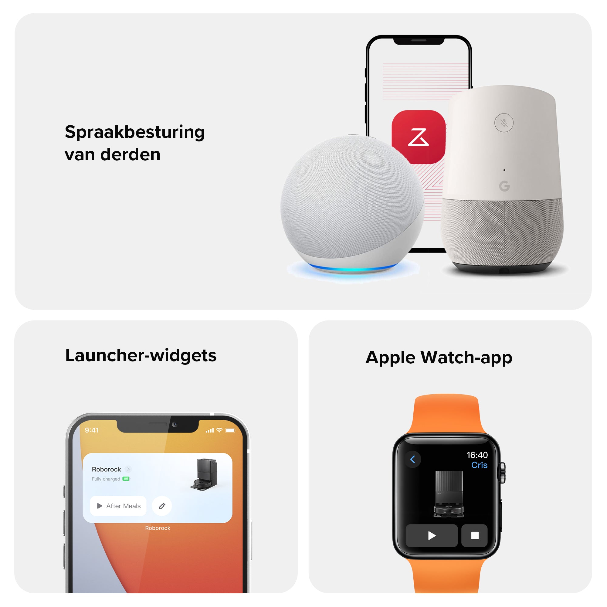 Spraakopdrachten via Amazon Alexa, Apple Siri-opdrachten of Google Home.