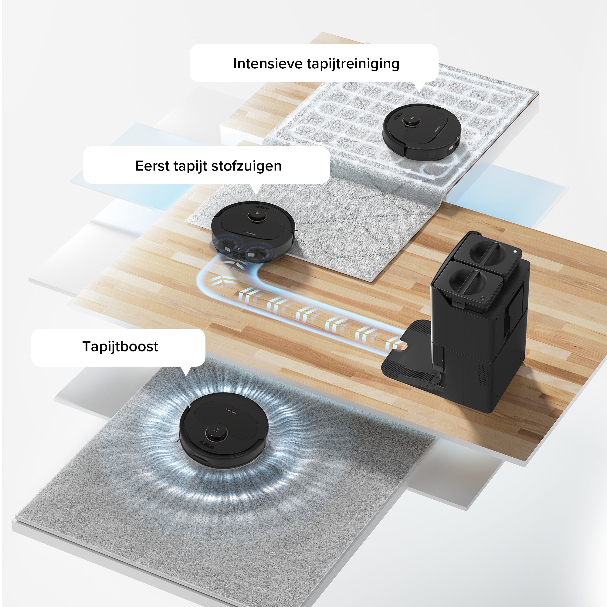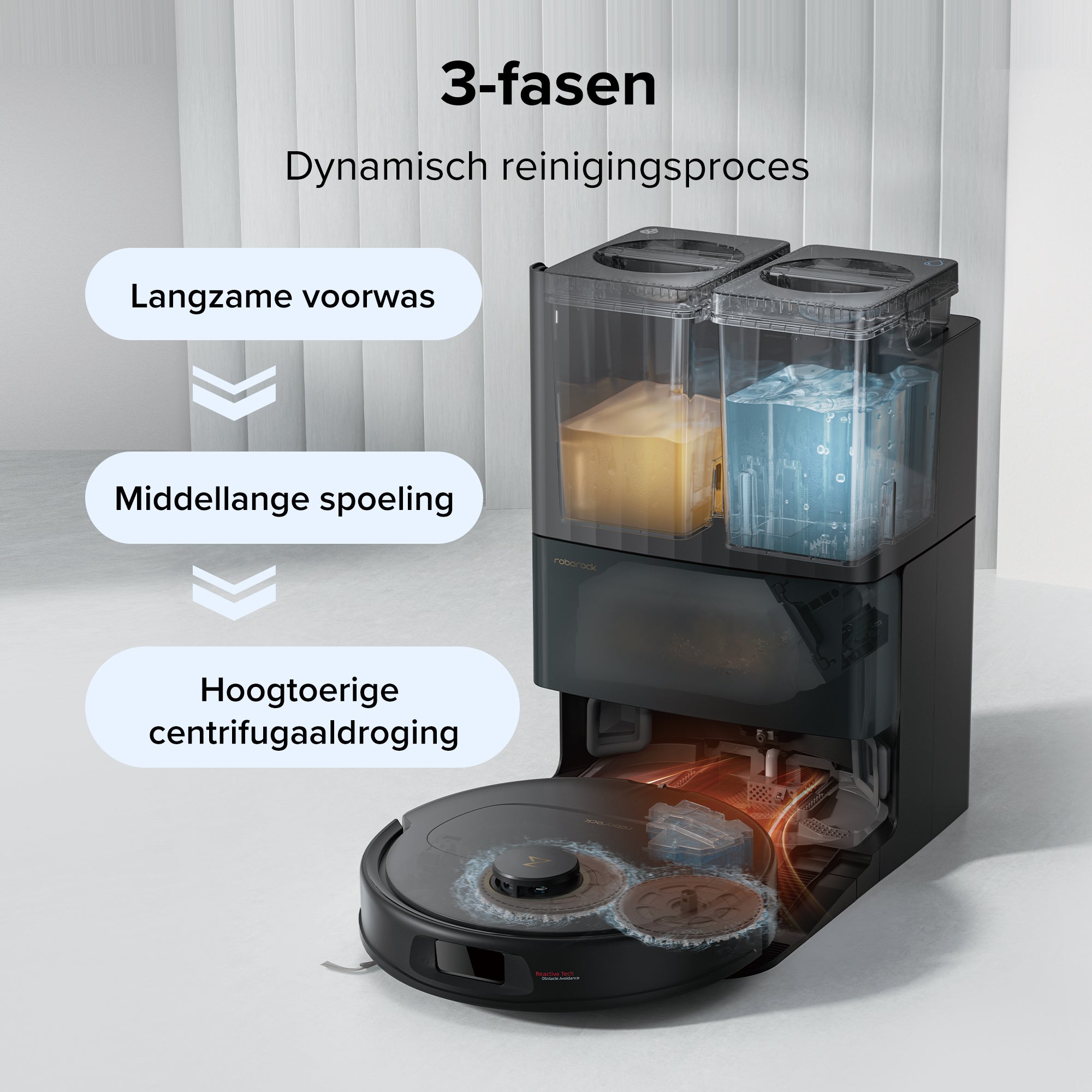 Geïnspireerd door het reinigingsproces van een wasmachine biedt het multifunctionele dock een uitgebreide dweilwaservaring. Dit omvat een langzame voorwas, een middellange spoeling en een hogesnelheidscentrifuge voor drogen. Bovendien worden de snelheid en de waterstroom dynamisch aangepast voor hoge efficiëntie en een groot gebruiksgemak.