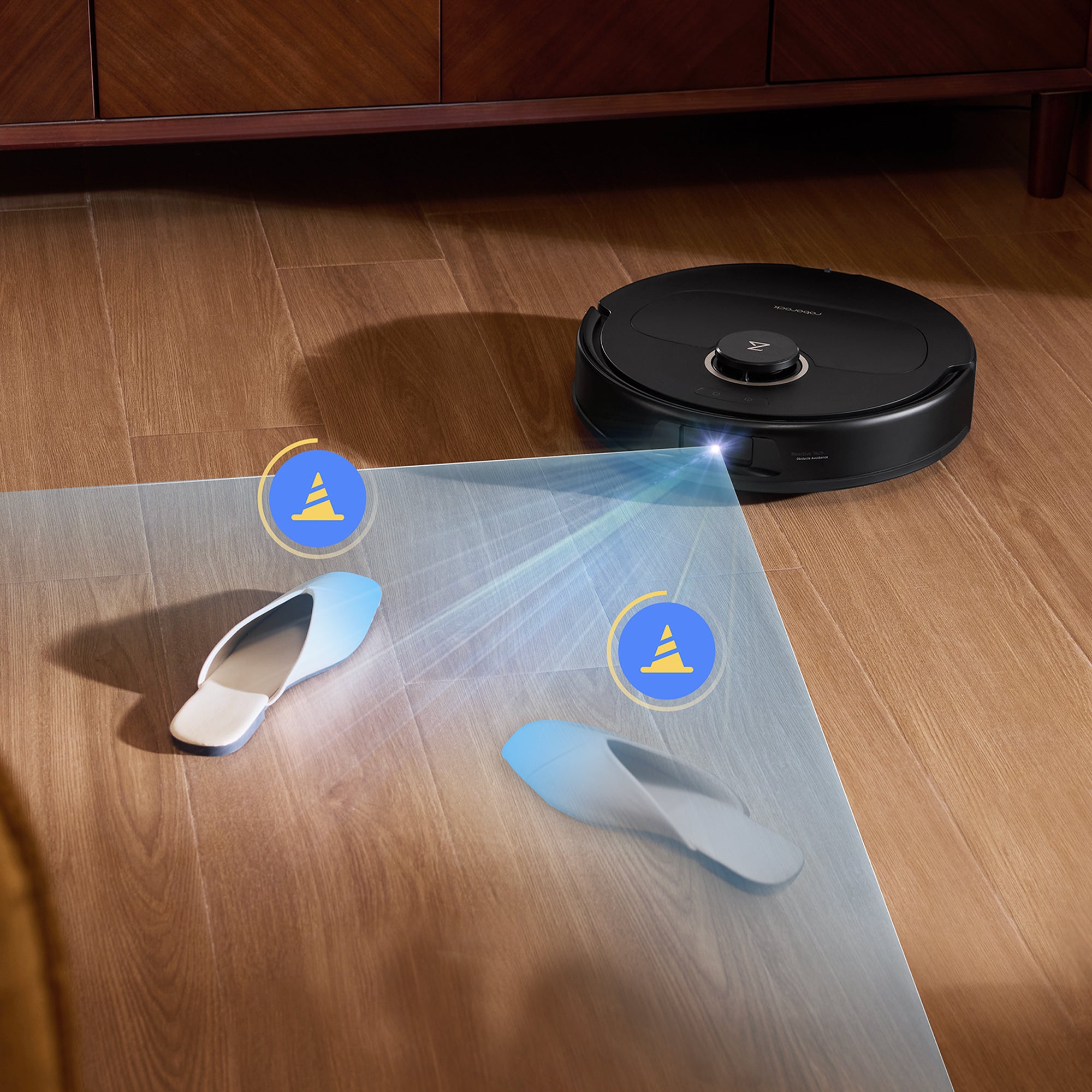 De robot maakt gebruik van gestructureerd licht om zeer efficiënt obstakels te herkennen. Zelfs in een rommelige kamer met voorwerpen verspreid over de vloer kan het moeiteloos obstakels detecteren en eromheen navigeren.
