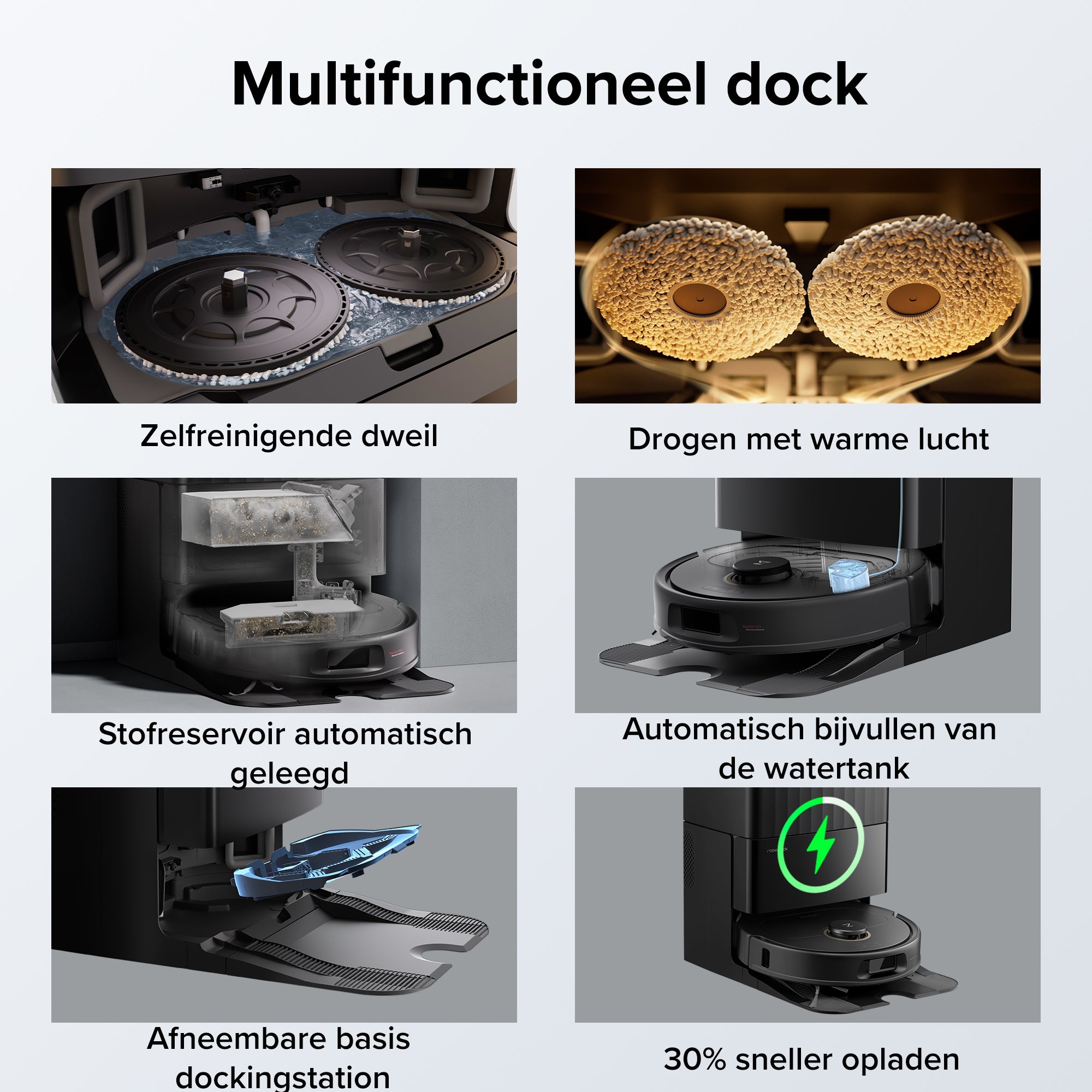 Het multifunctionele dock is uw ideale volledig geautomatiseerde oplossing. Het doet veel meer dan alleen de robot legen en wassen, zodat u kunt concentreren op de dingen die er echt toe doen in het leven.