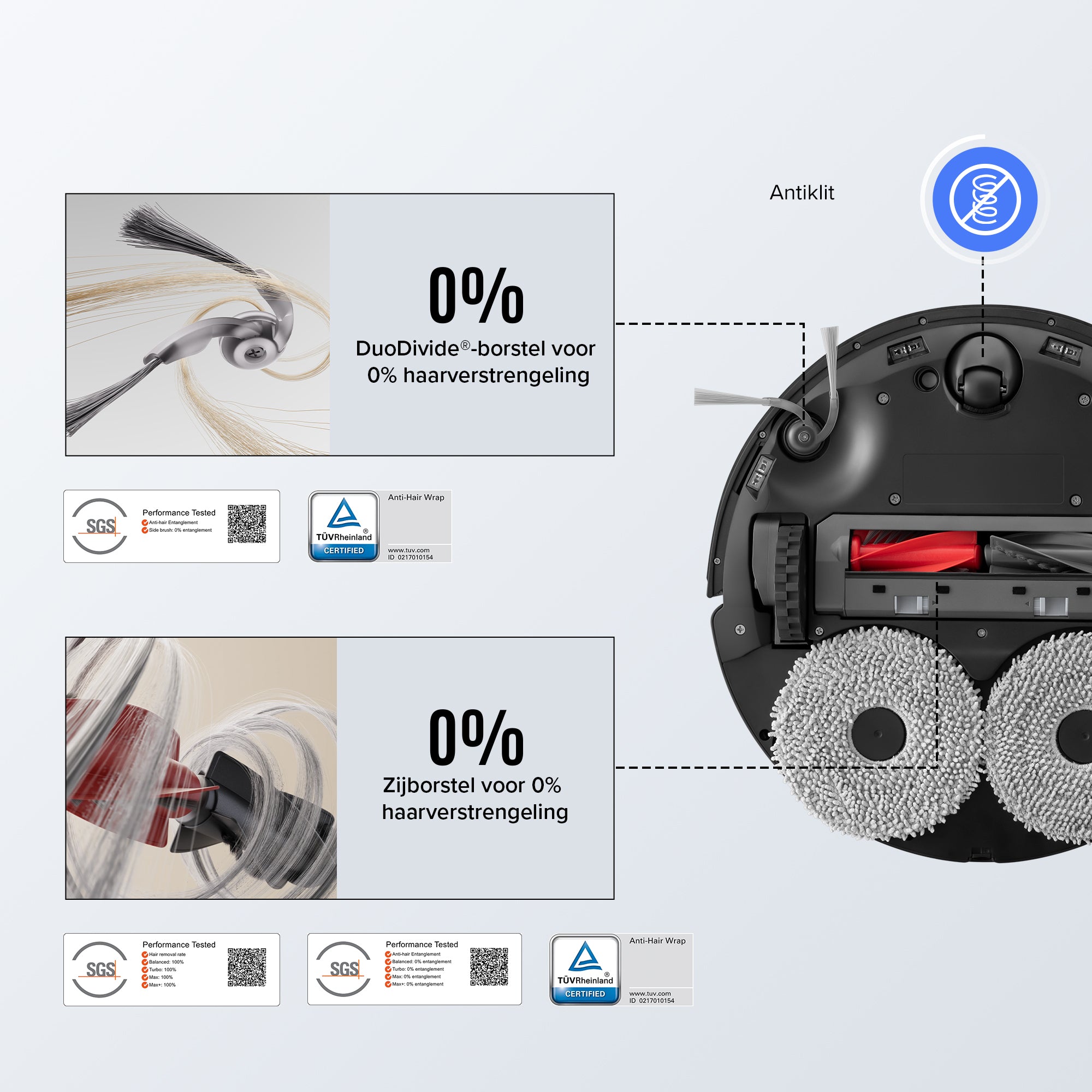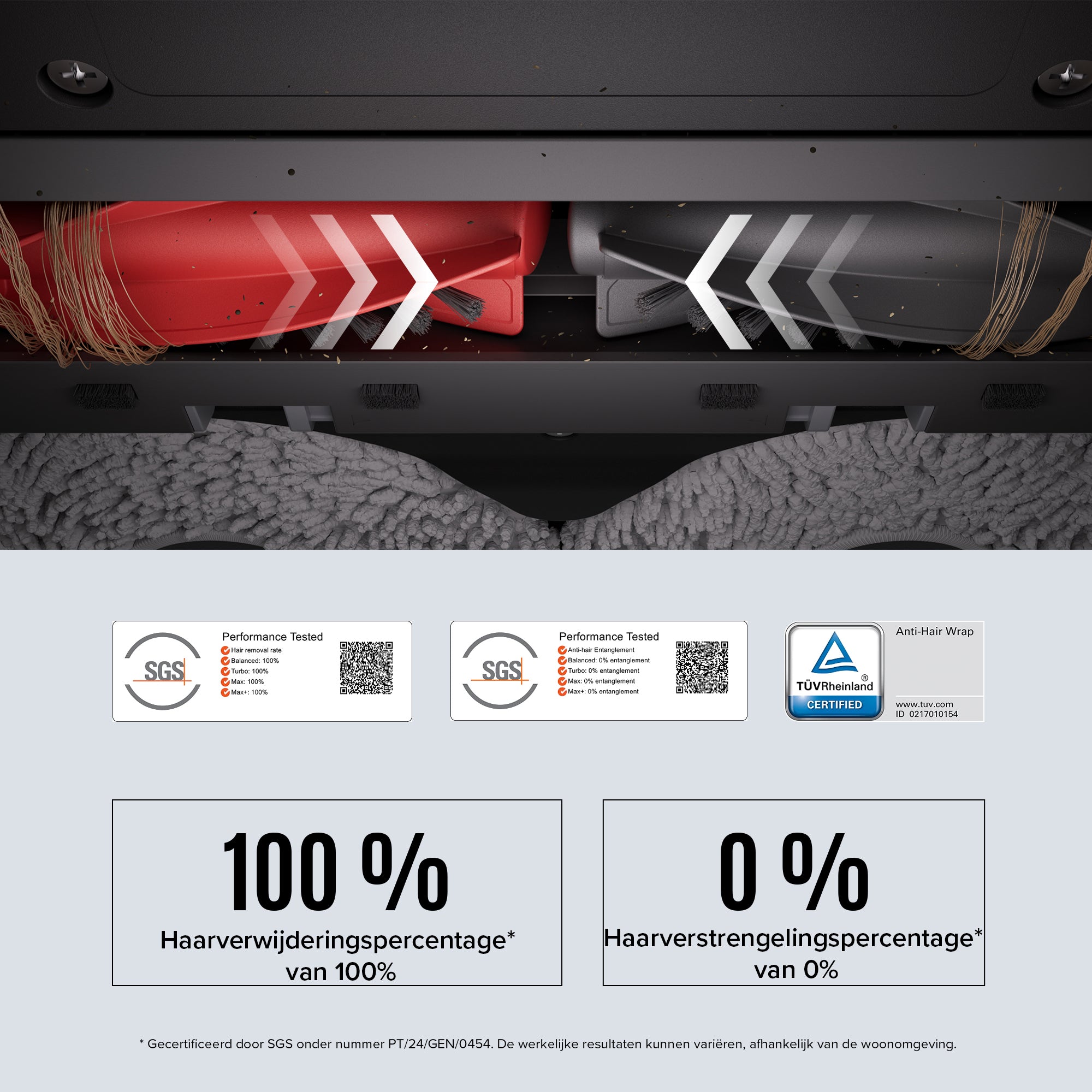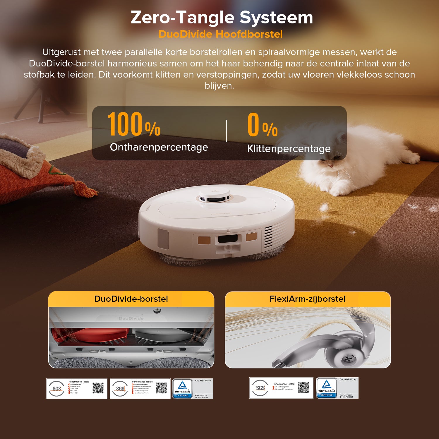 Ervaar ultieme reiniging met de DuoDivide-borstels en -zijborstel. Ideaal voor woningen met huisdieren, waar lange haren vaak vastklitten in het tapijt. De stofzuiger is SGS-gecertificeerd en behaalt een haarverwijderingspercentage* van 100% op alle vloertypen en een haarverstrengelingspercentage van 0%.