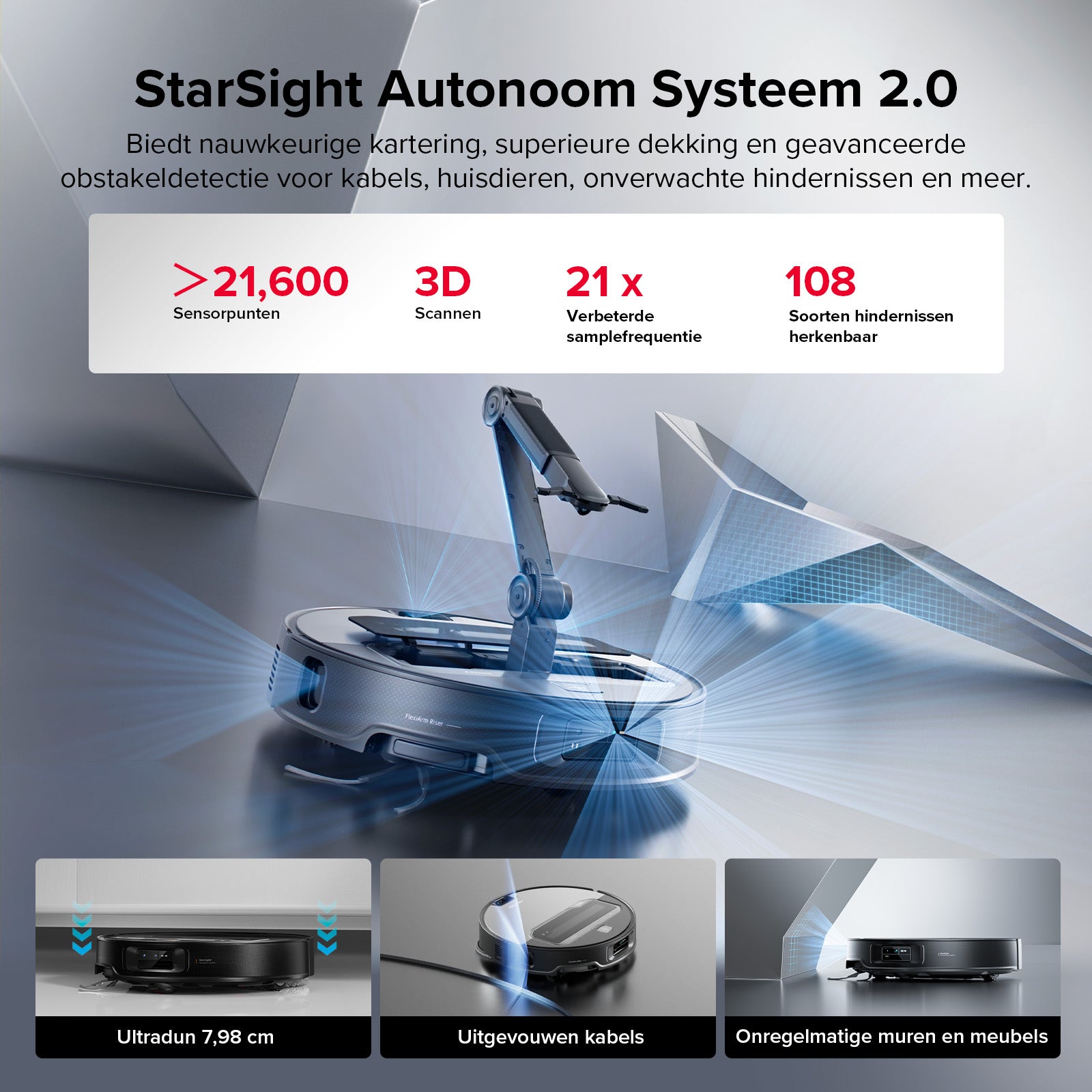 *App-verbinding en configuratie zijn vereist voor de functie obstakelbeheer. De werkelijke prestaties kunnen variëren als gevolg van software-updates en omgevingsfactoren.